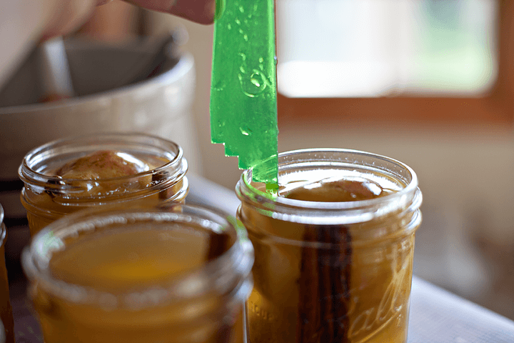 Now it’s time to create your preserving liquid. As a kid, my Mom would can pears and peaches in a sugary syrup that as a kid was heavenly. Now that I’m an adult, it’s a little too sugary for me. That’s why I LOVE this recipe that uses honey & apple juice instead… Here’s the recipe.